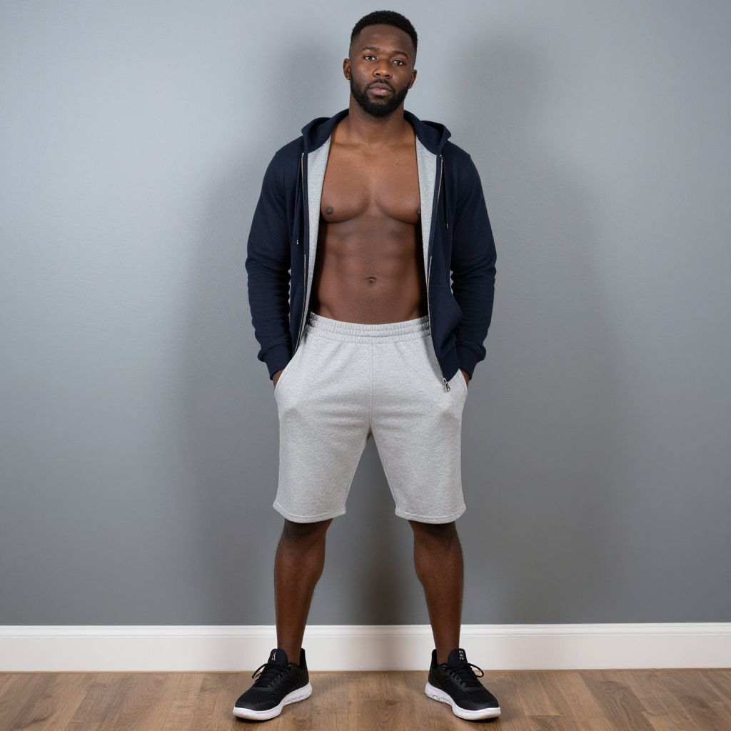 Sweatshirts man costume, 1boy, hood, solo, male focus, hoodie, hands in pockets, pants, red hoodie, facial hair, dark skin