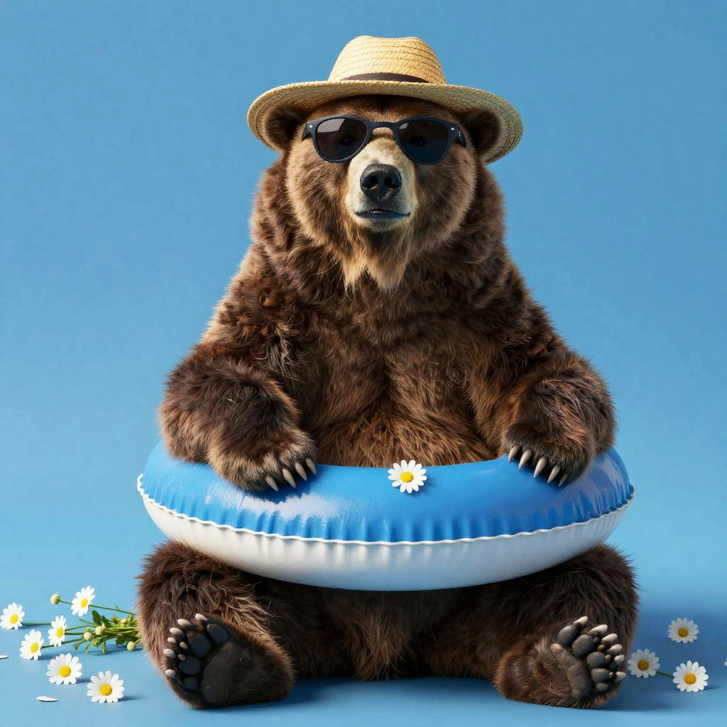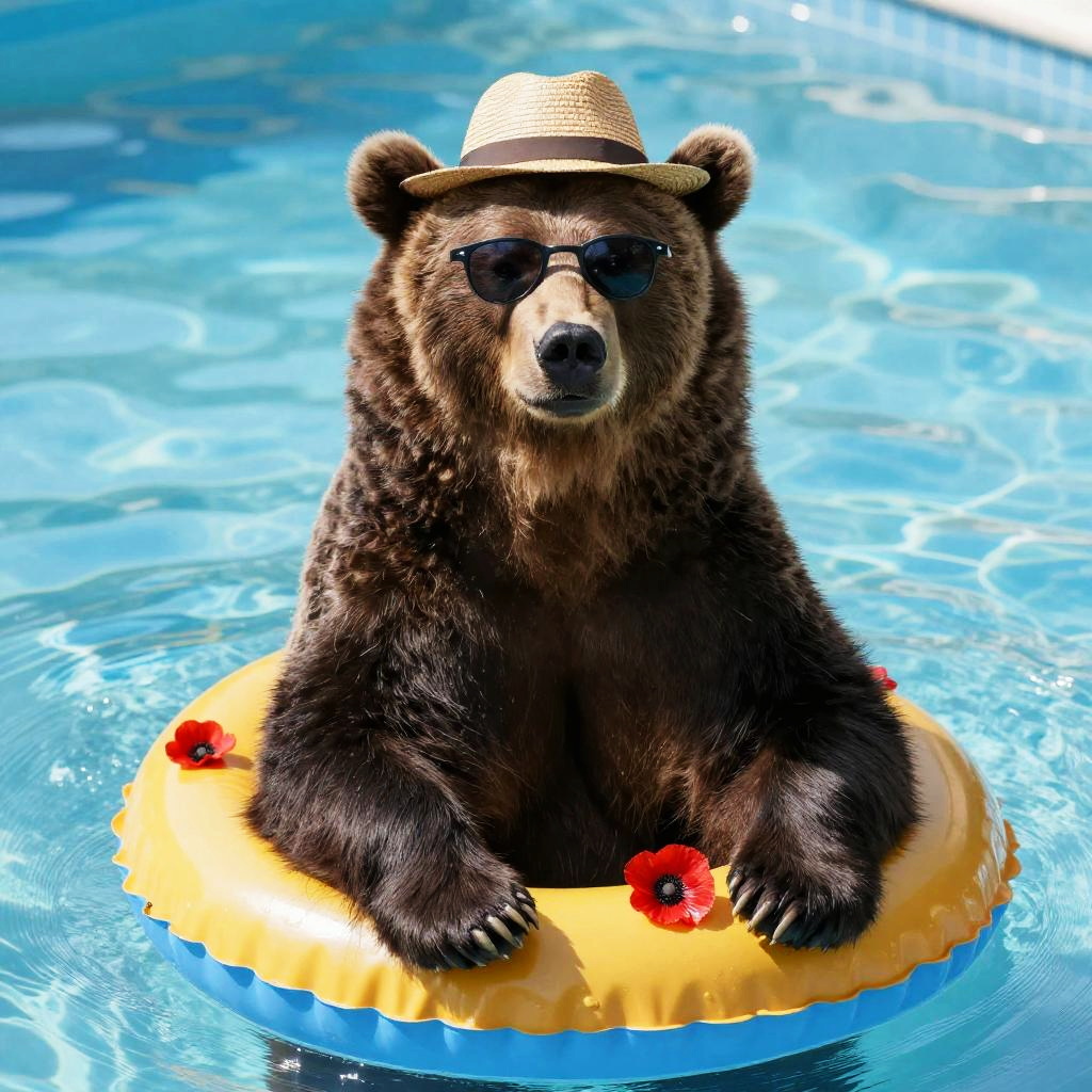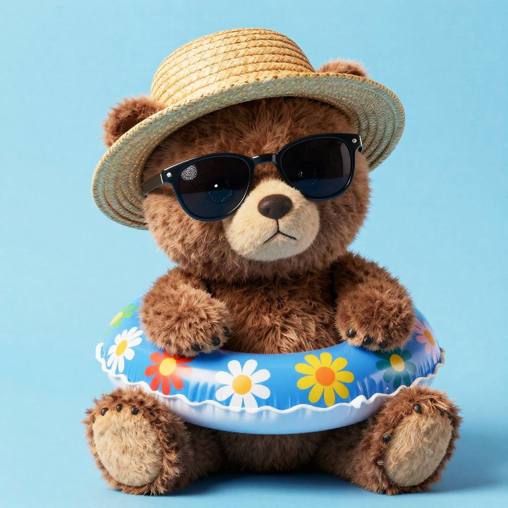 Illustration of a brown bear wearing stylish sunglasses and a wide-brimmed straw sun hat adorned with a blue ribbon and purple flower, sitting beside a purple inflatable swim ring on a solid blue background.