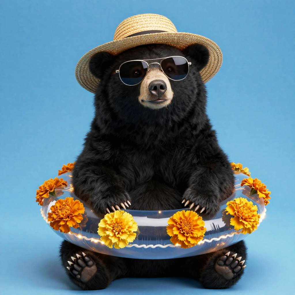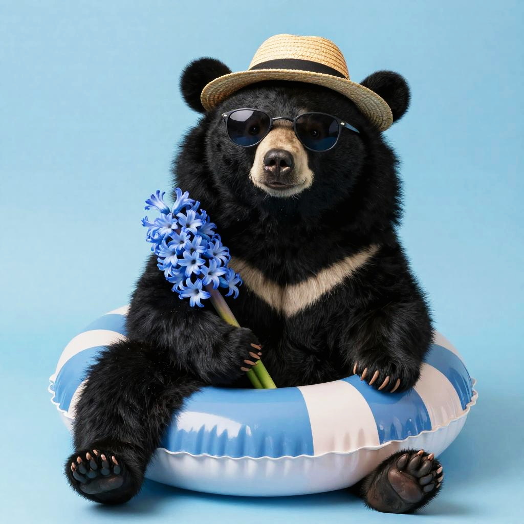 Full body, solo bear, animal focus, sitting bear, majestic Kodiak bear with a dignified composture, straw hat, sunglasses, swim ring, exotic purple orchid, watching eagerly on all fours, blue background