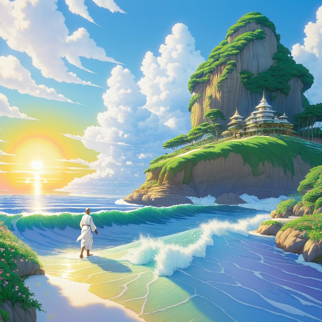 Hyper-detailed digital artwork depicting Mahatma Gandhi walking barefoot on a beach with waves gently breaking near the shore. In the background, a large rock formation covered in lush greenery hosts intricately designed pagoda-style buildings, evoking a Studio Ghibli fantasy atmosphere. The scene is set during a radiant sunrise or sunset, casting warm light over the ocean and landscape.