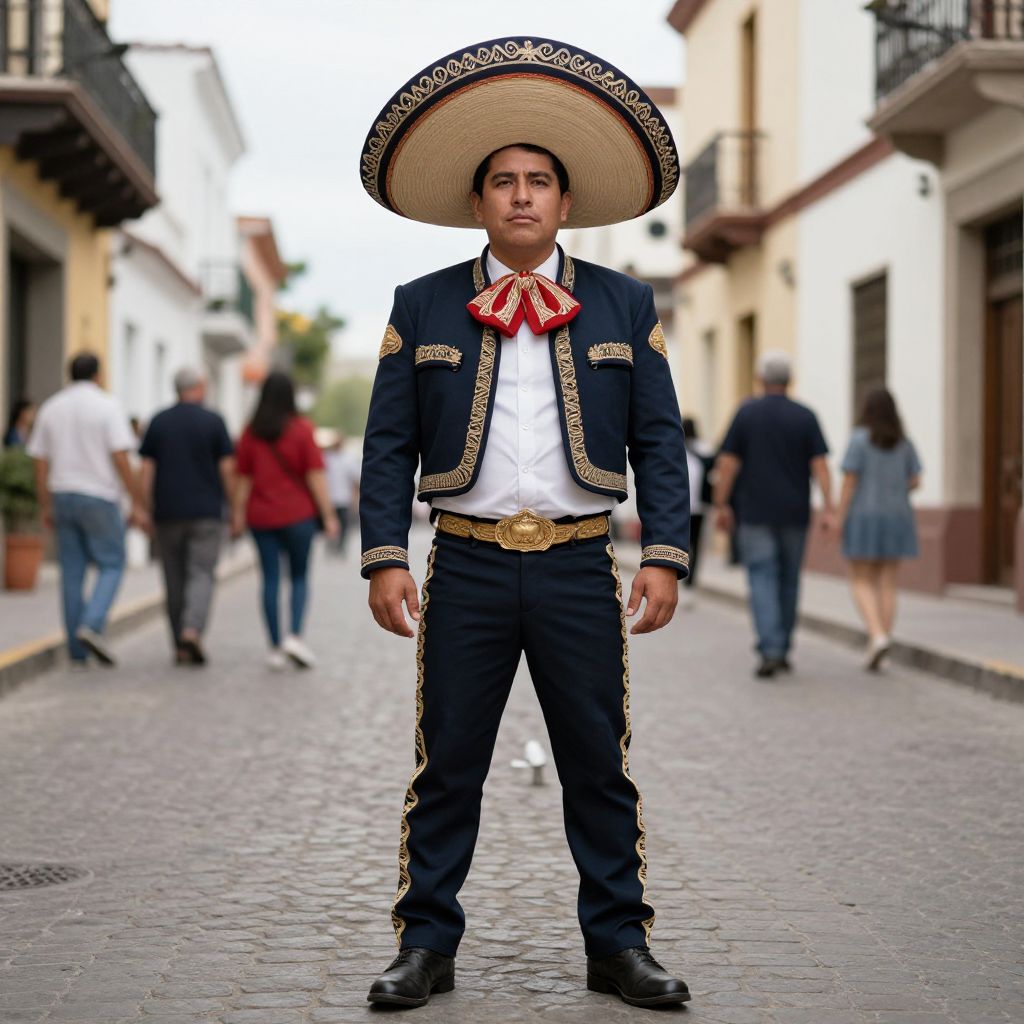 Photograph of a young Mexican man in traditional charro suit with oversized sombrero, standing confidently on a cobblestone street, people walking in the