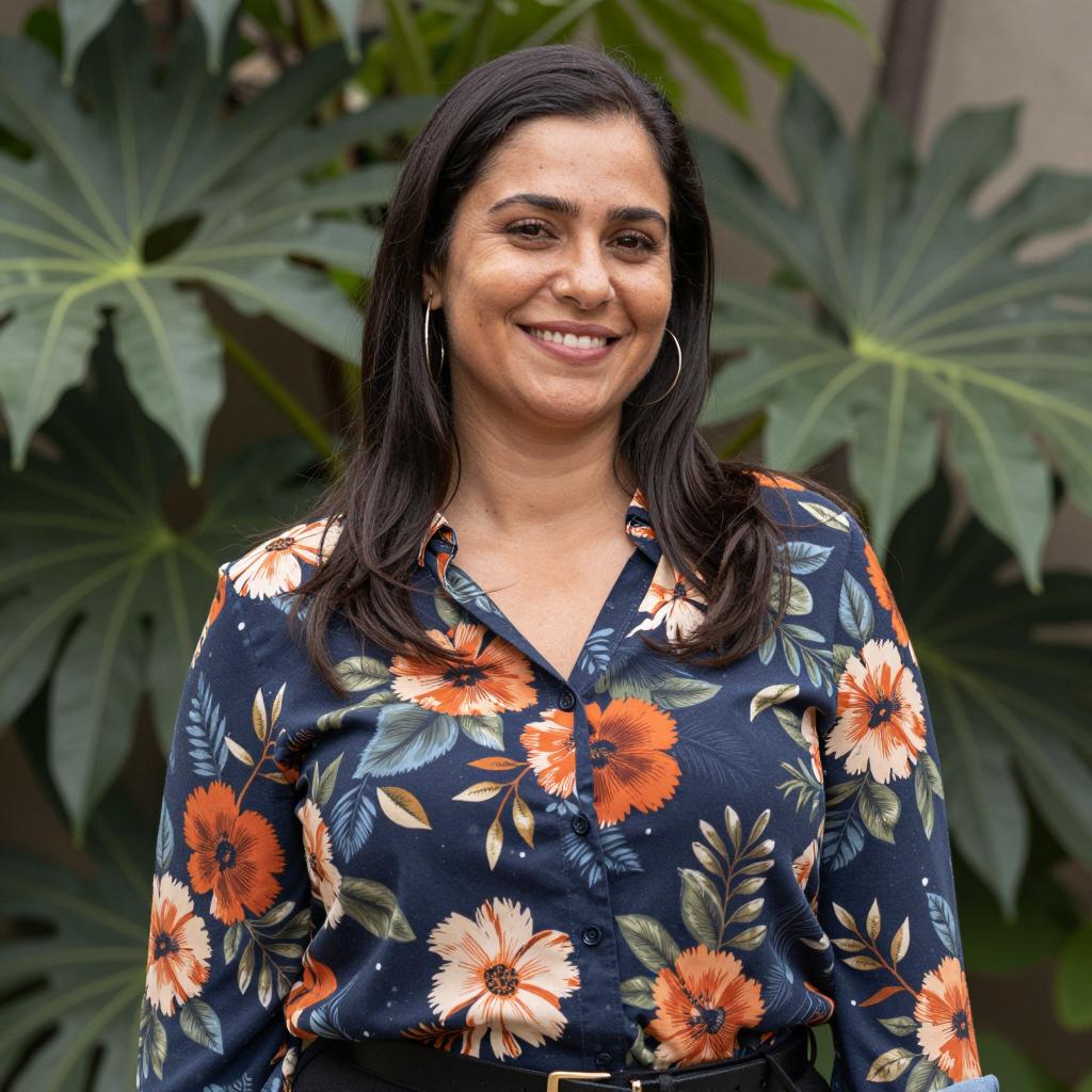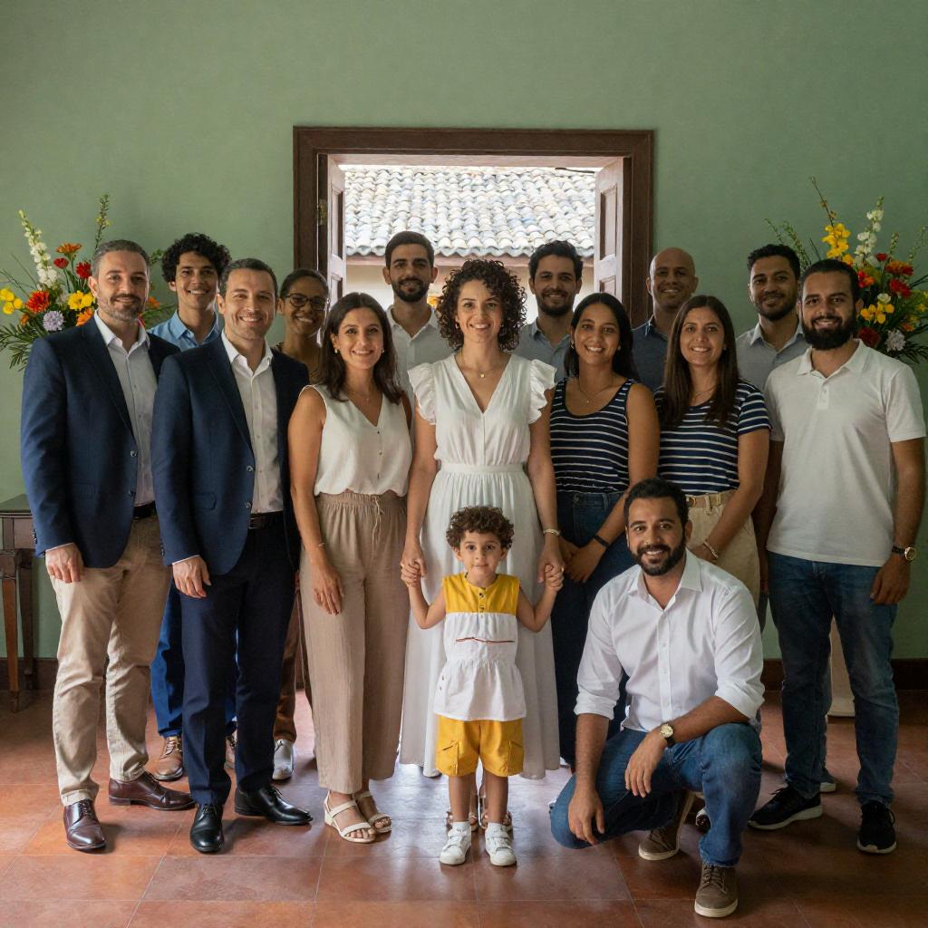 Group portrait of 14 people standing and kneeling inside a green-walled room with floral arrangements on either side. Centered is a woman with curly hair in a white dress holding hands with a young child dressed in a yellow and white outfit. The surrounding group consists of men in suits and casual clothing, and women wearing casual and striped tops. The background shows an open doorway with cobblestone roofing visible outside. People are smiling and posing together.
