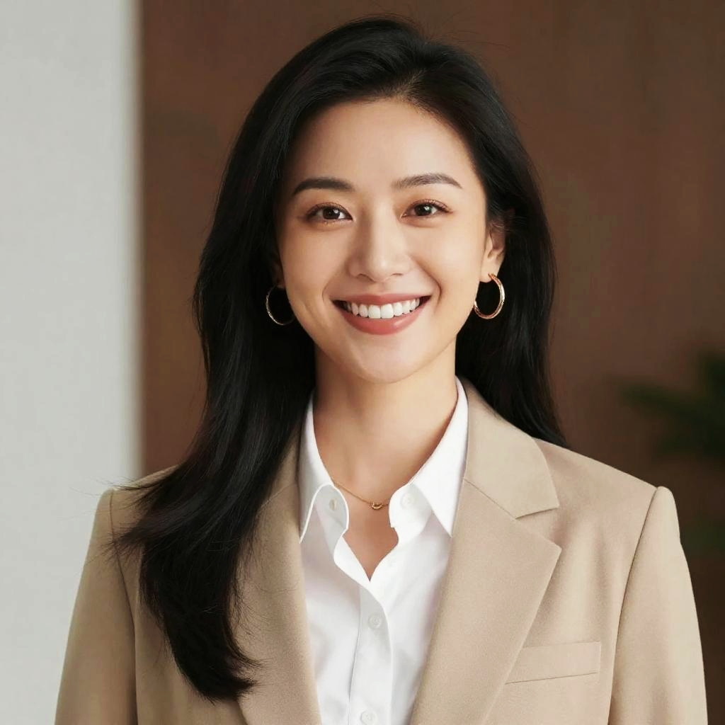 Photograph of an attractive Asian woman with straight black hair, wearing a white button-up shirt, smiling softly in a modern office.