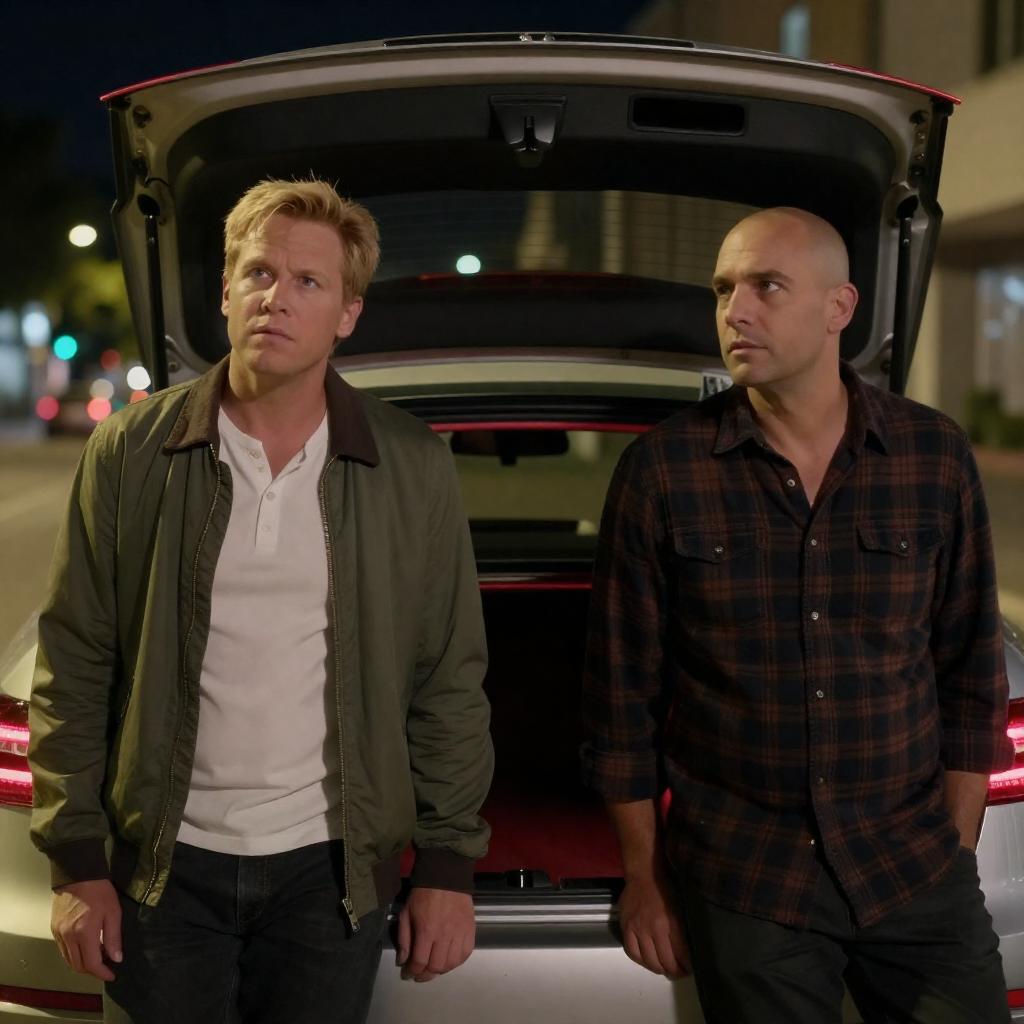 Photograph of two men at a red checkered table. Bald man in brown cardigan, glasses, holding blue patterned mug. Muscular man with short hair, black jacket, intense expression. Blood-stained knife on table, deer head on green patterned wall. Both lean forward, elbows on table. Mug in front, egg halves beside.