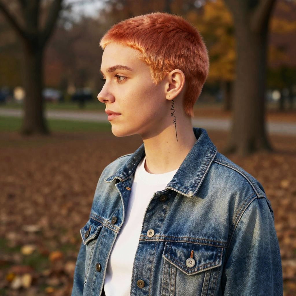 Ginger with a buzz cut, bright copper tones, minimalistic tattoo on neck, casual denim jacket, autumn park scene, warm golden hour lighting, photorealistic