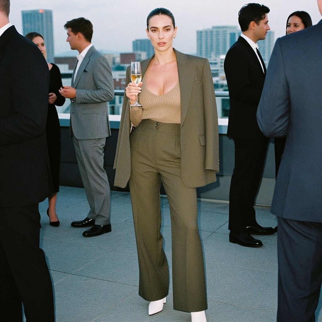 Photograph of a confident woman with pale skin and dark hair in an elegant updo, standing on a rooftop. She wears an olive green, tailored suit with a deep V-neck, revealing a hint of cleavage, and white pointed-toe heels. She holds a champagne flute in her right hand. In the background, several men in dark suits, white shirts, and black shoes are engaged in conversation. The rooftop has a modern, urban feel with a cityscape of tall buildings visible in the distance. The lighting is bright, suggesting a daytime setting.