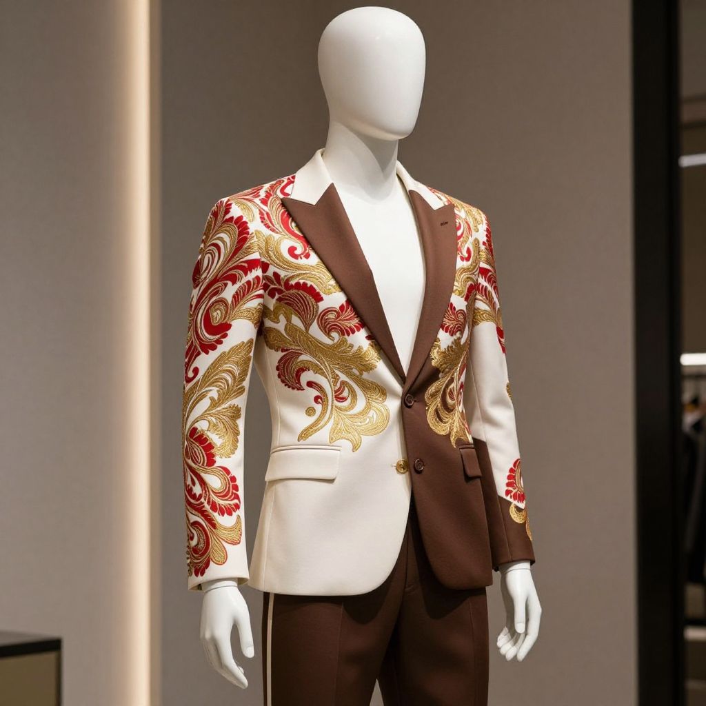 A mannequin wearing a white and brown outfit with a red and gold pattern on it, standing in a stylish, modern setting. The mannequin has an elegant, sophisticated appearance, with a sleek and polished look that exudes confidence and professionalism. The outfit is designed to be both fashionable and functional, with a focus on clean lines and a minimalist aesthetic. The red and gold pattern adds a touch of luxury and glamour to the ensemble, making it stand out in a contemporary setting. The mannequin is posed in a poised and attentive manner, highlighting the high-quality materials and attention to detail in the clothing. The overall image is intended to convey a sense of sophistication, style, and professionalism.