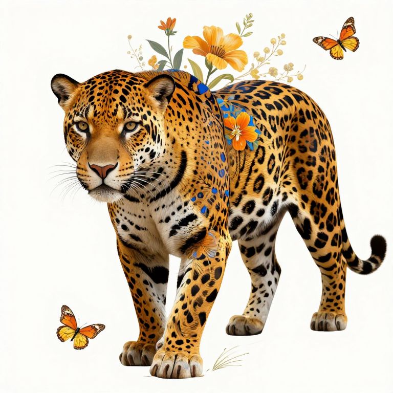 Digital illustration of a regal jaguar standing on a white background. The jaguar has a golden-yellow coat with black spots and a white underbelly. Bright orange and yellow flowers with blue accents adorn its back, and two orange butterflies flutter around. The jaguar's intense, amber eyes and confident stance are prominent. The flowers and butterflies add a whimsical, artistic touch to the realistic depiction of the jaguar. The image combines elements of realism and fantasy with vibrant colors and detailed textures.