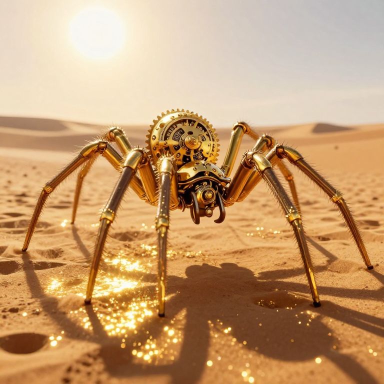Colossal clockwork spider stands poised amidst a radiant field of molten gold, its intricate gears and golden embellishments glowing against the backdrop of a sunlit desert landscape, casting shimmering reflections that dance across the sandy terrain.
