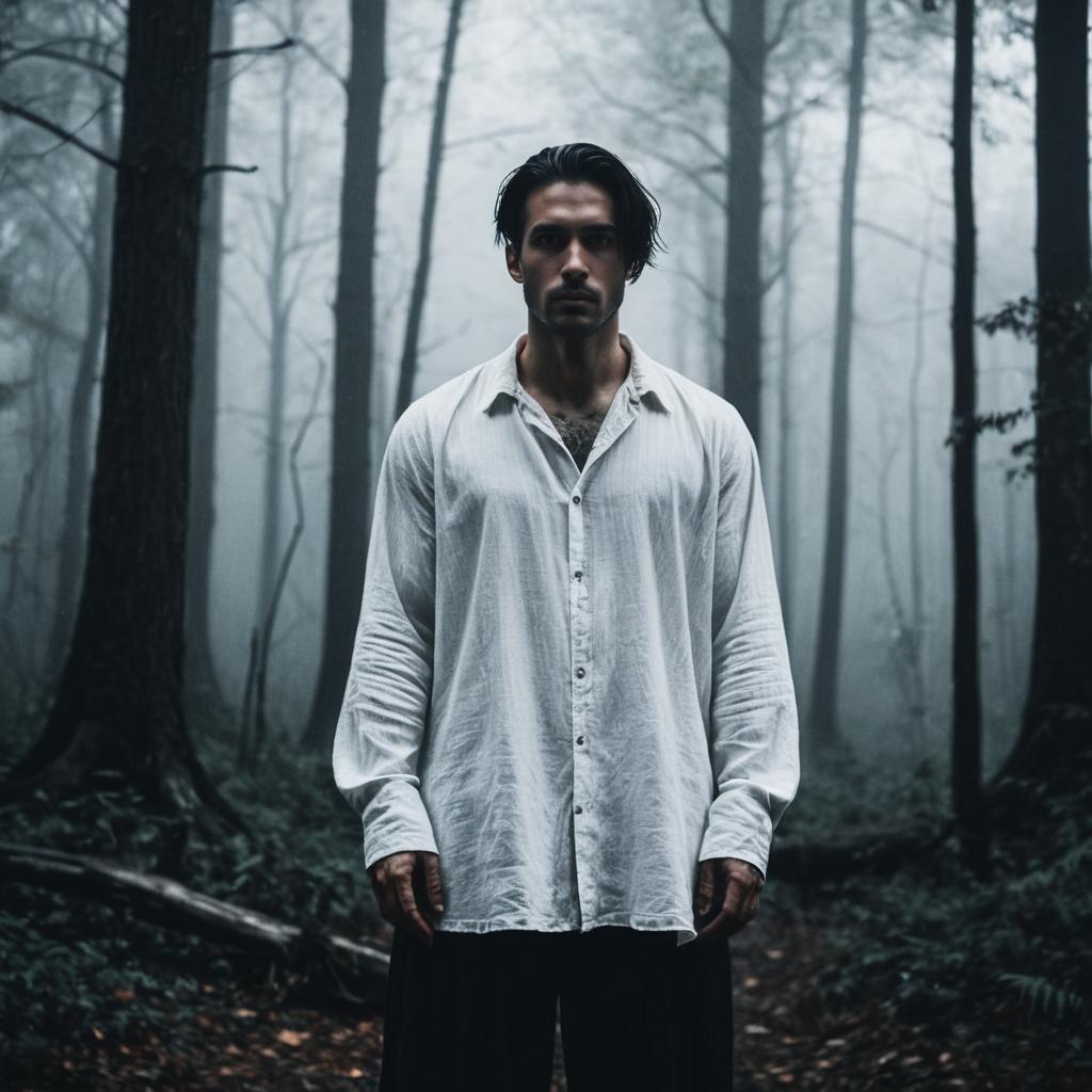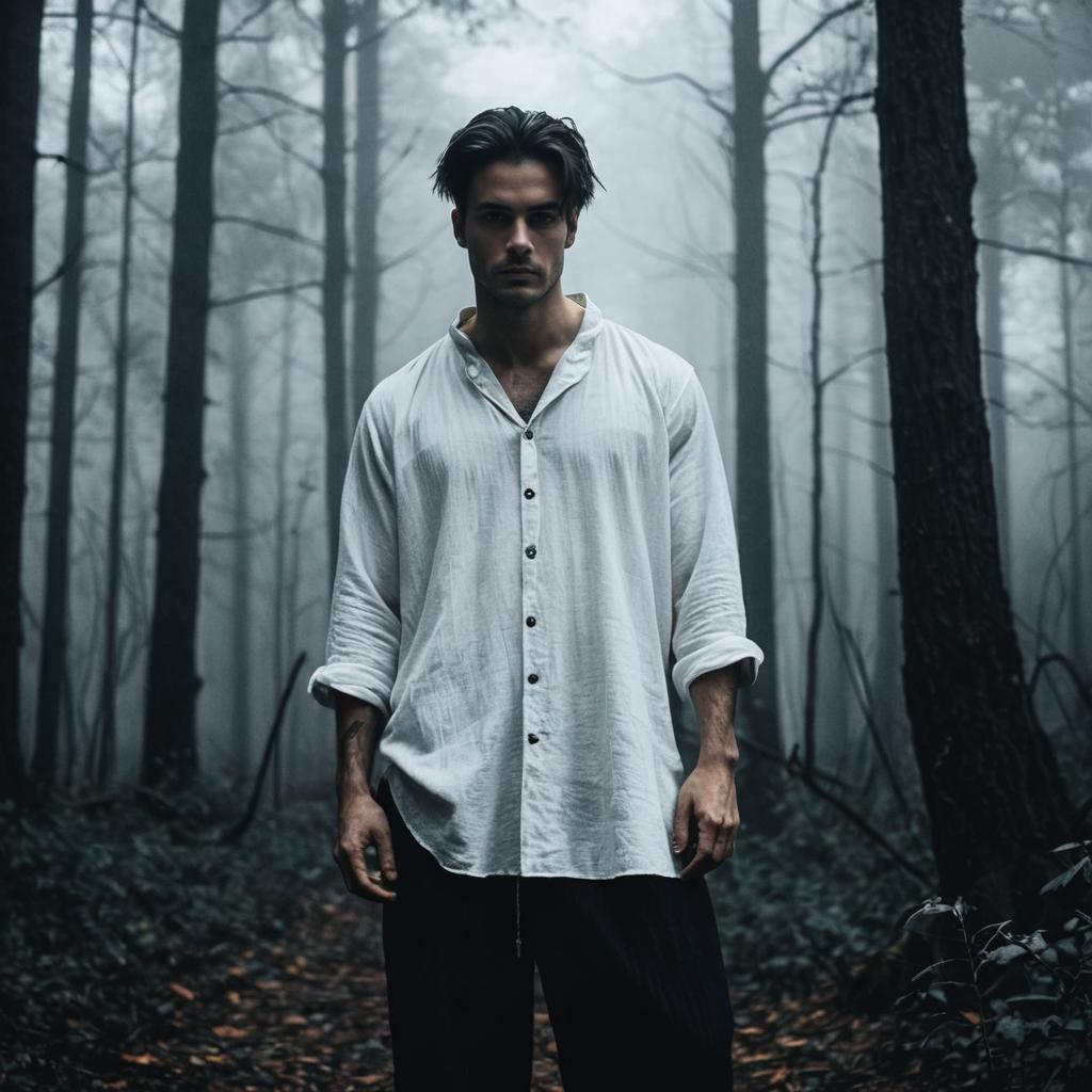 Man, styled hair, defined jawline, and smooth skin, wearing a loose white tunic shirt with wide pants. (Design a Gothic scene set in a haunted, foggy forest)