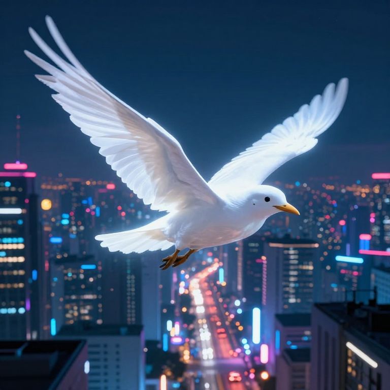 A luminous white bird soars above a cyberpunk-inspired cityscape at night, its wings illuminated against the dramatic sky as neon-lit streets stretch into the distance, evoking a dreamlike, high-definition digital art aesthetic.