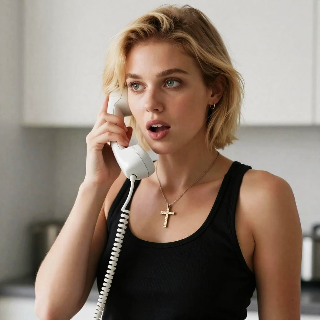 Blonde woman with short hair, light skin, smiling slightly, wearing brown leather jacket with white lace collar, holding silver phone to ear, gray background, necklace with small key pendant, upper body shot.