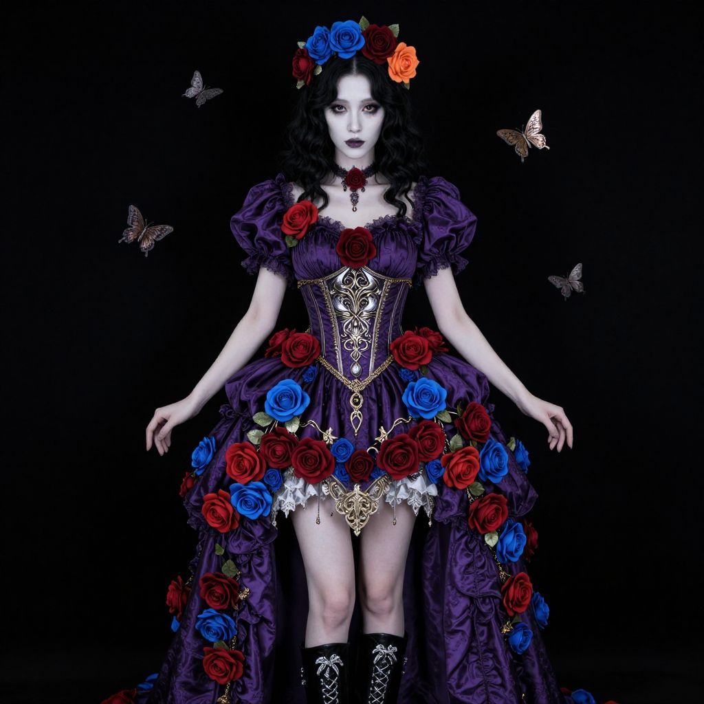 A photo of a gothic-style woman with pale skin and dark, wavy hair. She's wearing an elaborate purple dress adorned with red and blue roses, puffed sleeves, and intricate gold details. Her corset is metallic with ornate patterns. She has a flower crown with blue, red, and orange roses, and knee-high black boots with silver accents. Small metallic butterflies float around her against a dark background.