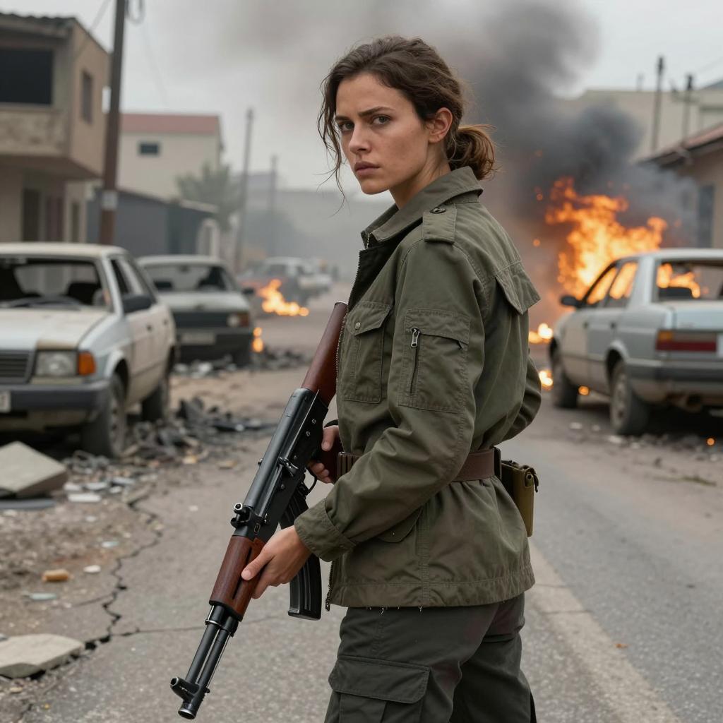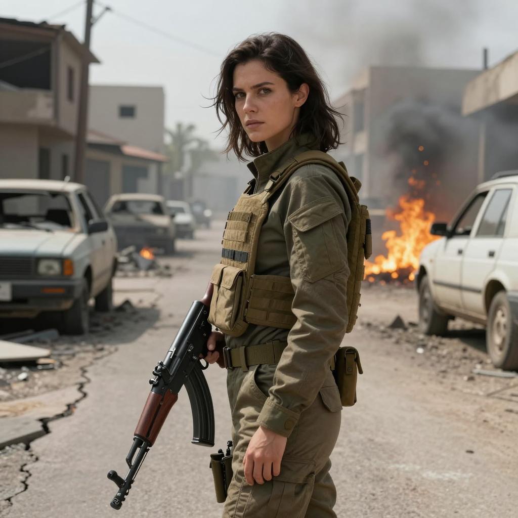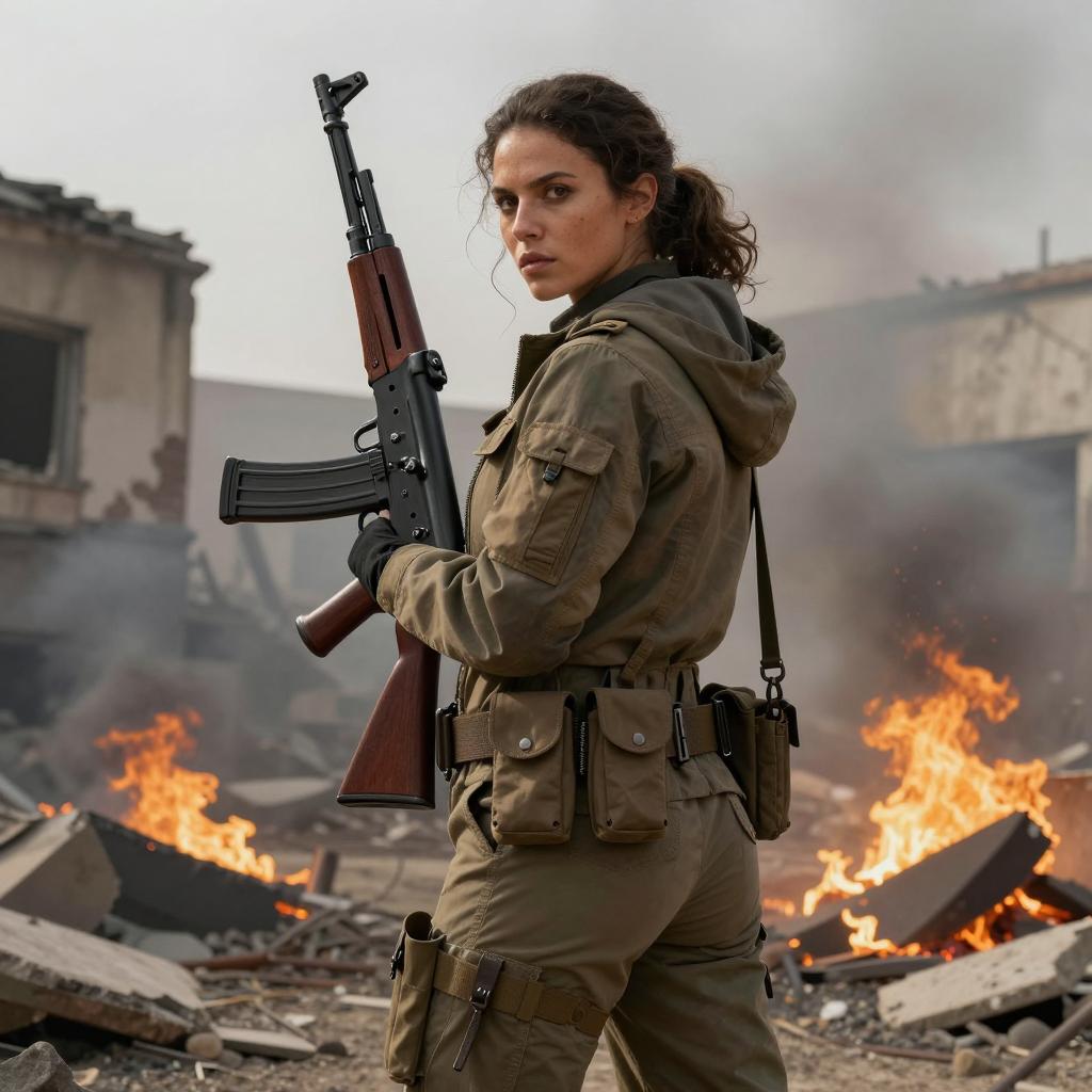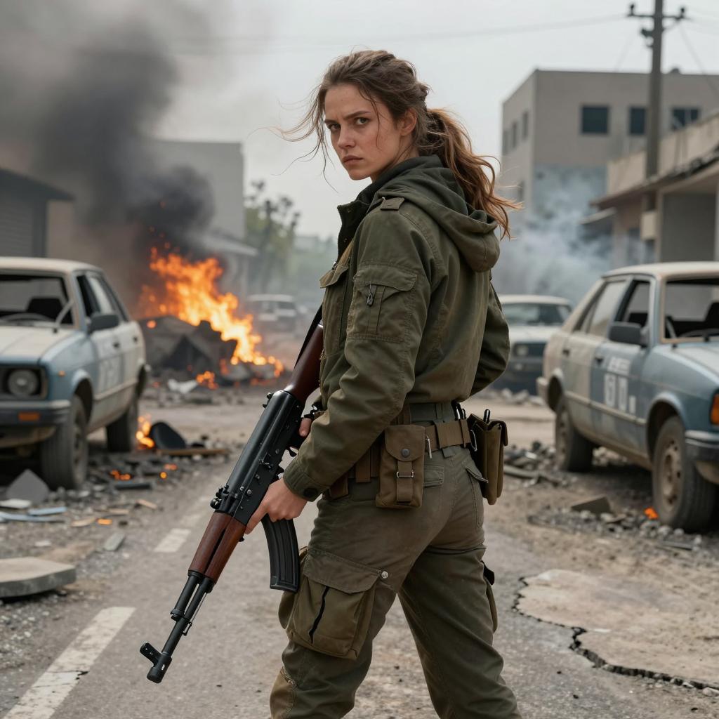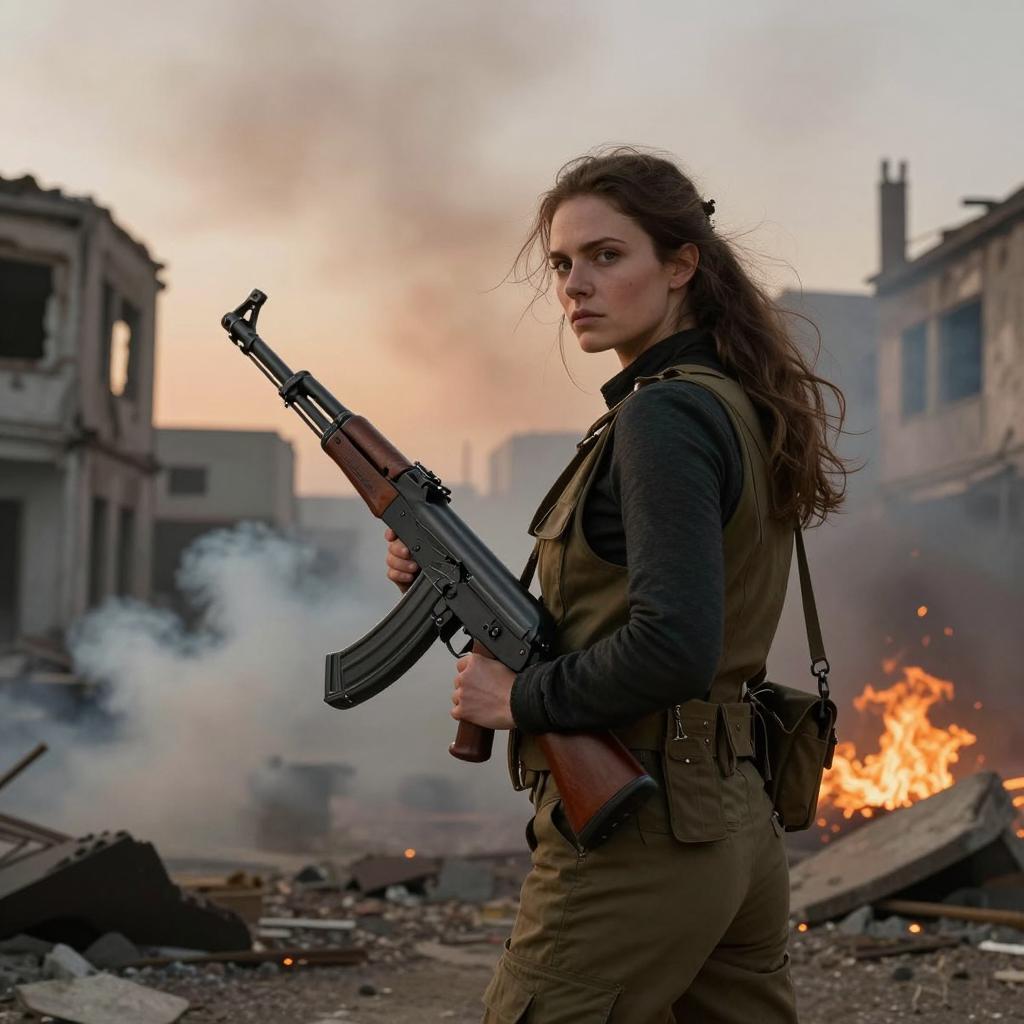 Woman with ak-47 gun in a war-torn city, cinematic non-violent scene, woman with dark wavy hair and focused look wearing dark long-sleeve top under a military vest and trousers posed standing square to the camera, rifle slung on shoulder, calm intense gaze in ruined city street with burning debris in the distance, dramatic smoke and fire effects, high resolution, ultra-detailed, no blood, no gore