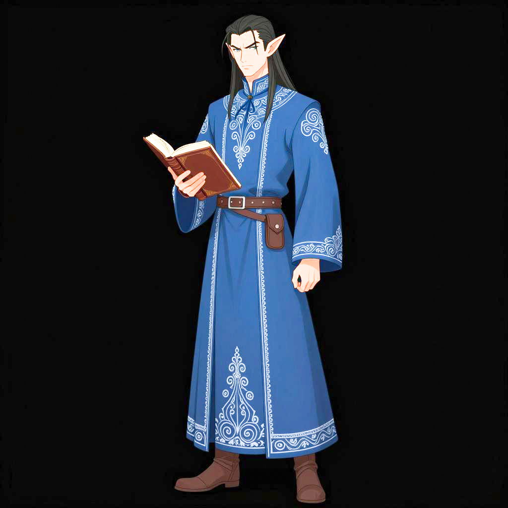 Digital illustration of a tall male elf with long blonde hair and pointed ears, wearing an elaborate green and gold armor adorned with green gemstones. The character is dressed in a white and green ornate robe featuring gold patterns, complemented by a matching cape draped over the shoulders. The elf stands with arms at sides, sporting golden shoes and a neutral expression against a dark gray background.