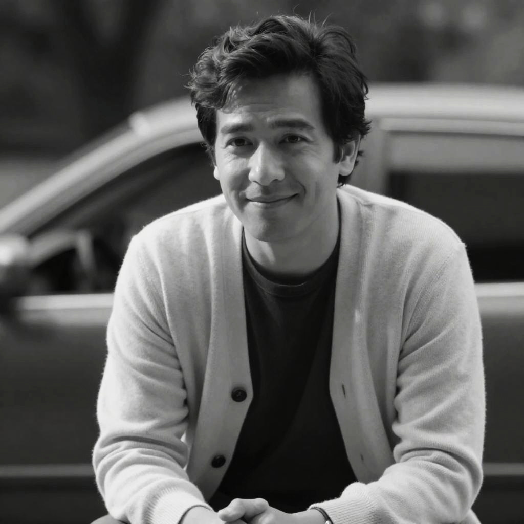 Photograph of a man with long dark hair, wearing a brown coat, holding a small child with curly hair close to his face. Soft, warm light from blurred bulbs in the background. Man's expression is focused and gentle. Dark, shadowy setting. Two people.