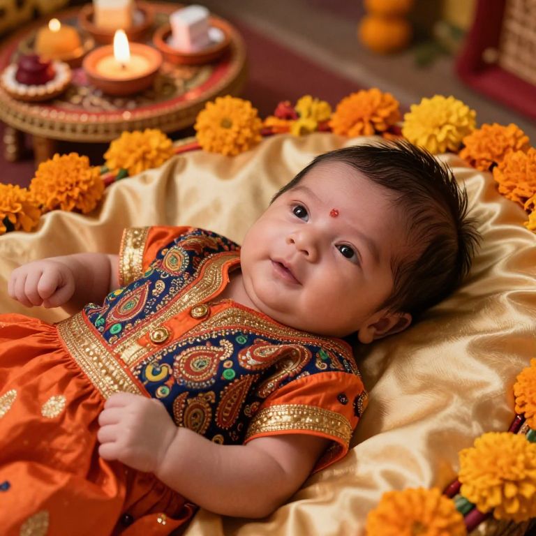 Realistic close-up photography of a newborn in a festive Diwali outfit with traditional paisley patterns and a bright orange and gold border, the baby is lying in a silk-lined cradle with soft lighting, surrounded by marigold flowers and a small Diwali decoration table with candles and sweets, the baby's face is tender and chubby with gentle smile lines