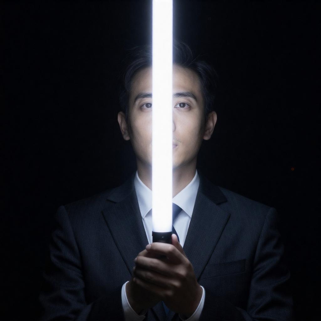 Photograph of a man with short dark hair, wearing a dark pinstripe suit and white shirt, holding a glowing white light source vertically in front of his face. The background is dark with faint orange and black speckles. His expression is focused upward. The light creates a stark contrast against his face and suit.