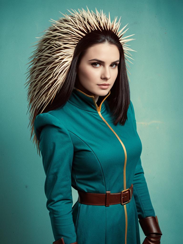 Portrait of a young woman wearing a detailed echidna-inspired costume featuring a striking headpiece resembling echidna spines, a teal fitted jacket with a golden zipper, brown leather gloves, and a matching wide belt. The outfit and styling suggest cosplay or fantasy character design.