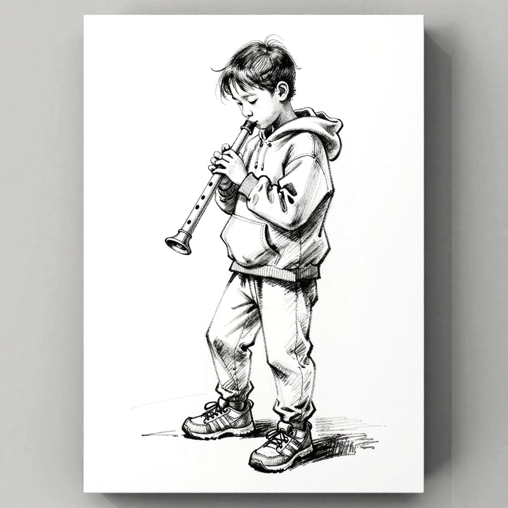 This is a line and wash sketch study of a child with a hoodie and sneakers holding a tin whistle. One leg slightly forward, head tilted down, eyes on the strings. Quick gestural lines, confident hatching, smudged shading, casual and spontaneous. High contrast black and white on mostly white background with soft gray side borders and subtle paper texture. Clean composition, minimal props, slight figure tilt. Studio light from above, gentle falloff, elegant and restrained mood.