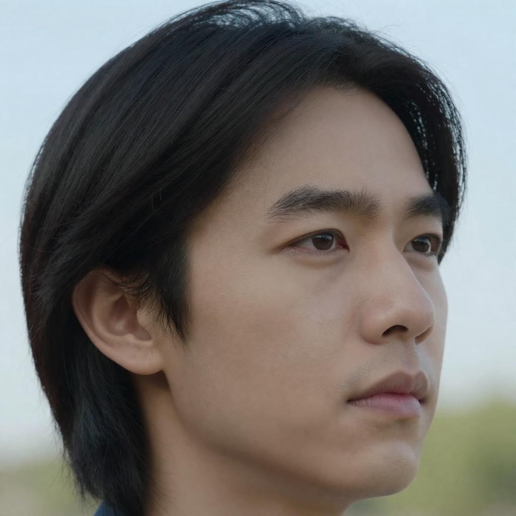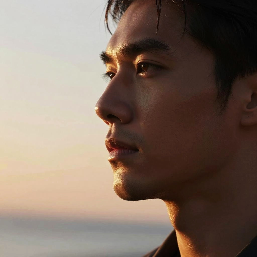 Close-up profile of a young Asian man with facial hair illuminated by warm dramatic sunset lighting. The photorealistic image highlights shiny skin texture with a soft-focused ocean background, creating a serene and contemplative mood.