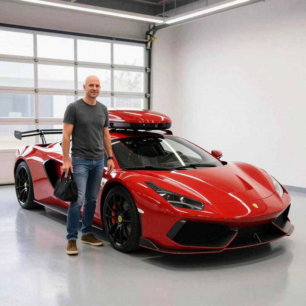 Photograph of a bald man in a gray shirt and jeans standing beside a bright red, high-performance sports car with a large black rear wing and roof box. The car is parked in a well-lit, modern garage with large windows in the background. The man is holding a black bag in his right hand. The car's sleek design and shiny surface contrast with the white and gray garage interior.