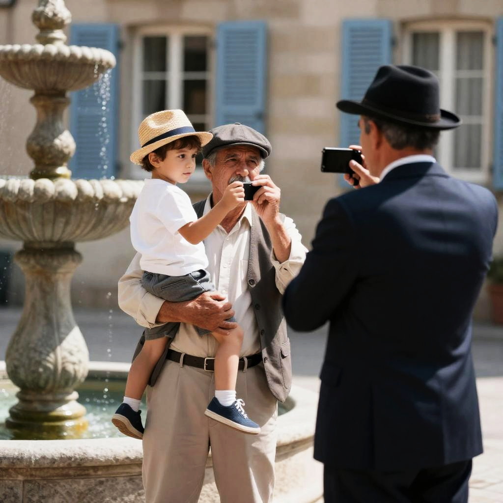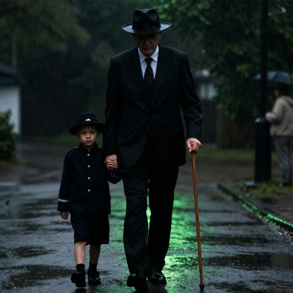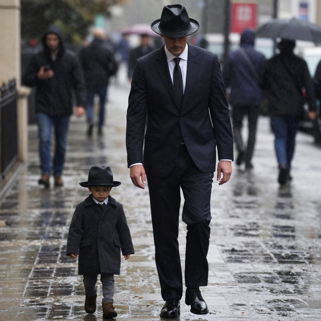 Photograph of a tall man in a dark suit, white shirt, and black tie, wearing a black fedora, walking in heavy rain. A smaller child with a matching hat and coat walks beside him. Rain slants diagonally across the image.