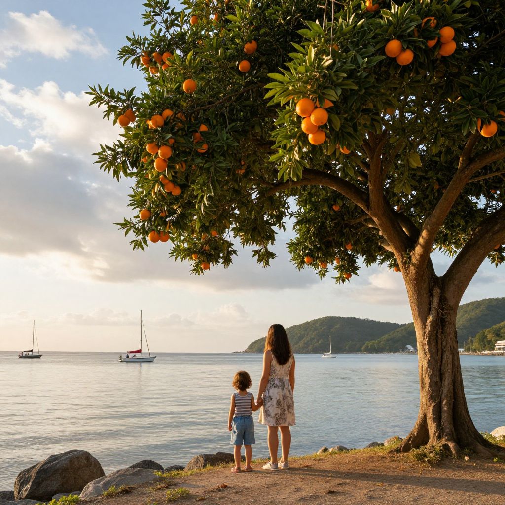 Sunset bathes a serene coastal scene where a woman and child stand beneath an ancient tree laden with vibrant orange fruits, overlooking calm waters dotted with sailboats and a distant green hill under a partly cloudy sky.