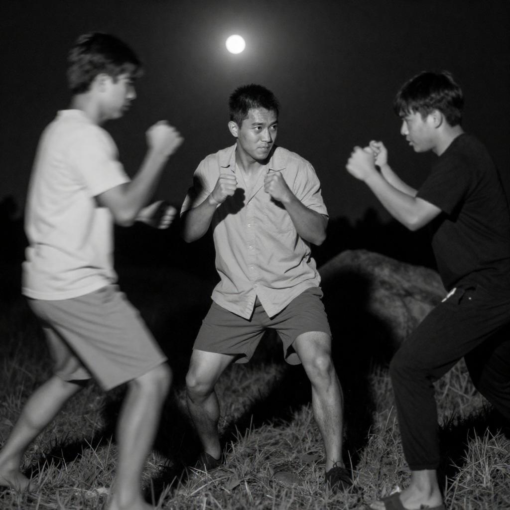Black-and-white photograph of three men in a nighttime fight scene. Central man in loose shirt and shorts, crouched with fists raised. Left man in flowing clothes, blurred from movement, swinging a weapon. Right man in dark clothing, also blurred, preparing to strike. Grass and rocks in background, lit by moonlight. All men have intense expressions.