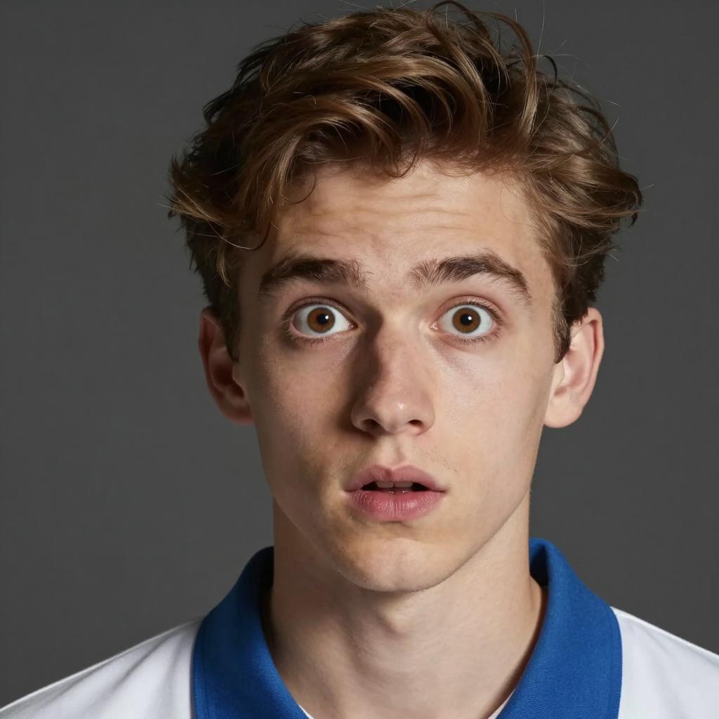A young man with light brown hair, slightly tousled, and large, surprised brown eyes. He has fair skin, a small amount of facial hair, and is wearing a white shirt with a blue collar. The background is blurred and dark. His expression is intense with wide eyes and slightly parted lips. The lighting casts a shadow on the left side of his face.