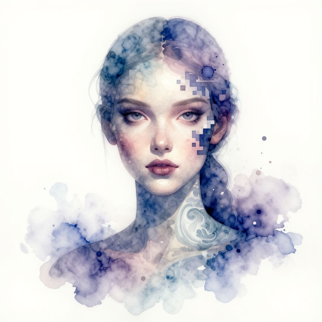 Watercolor AI illustrating a serene portrait of a humanoid figure composed of swirling watercolors and pixelated accents, soft gradients and intricate details combining the softness of handmade art with sharp futuristic aesthetics