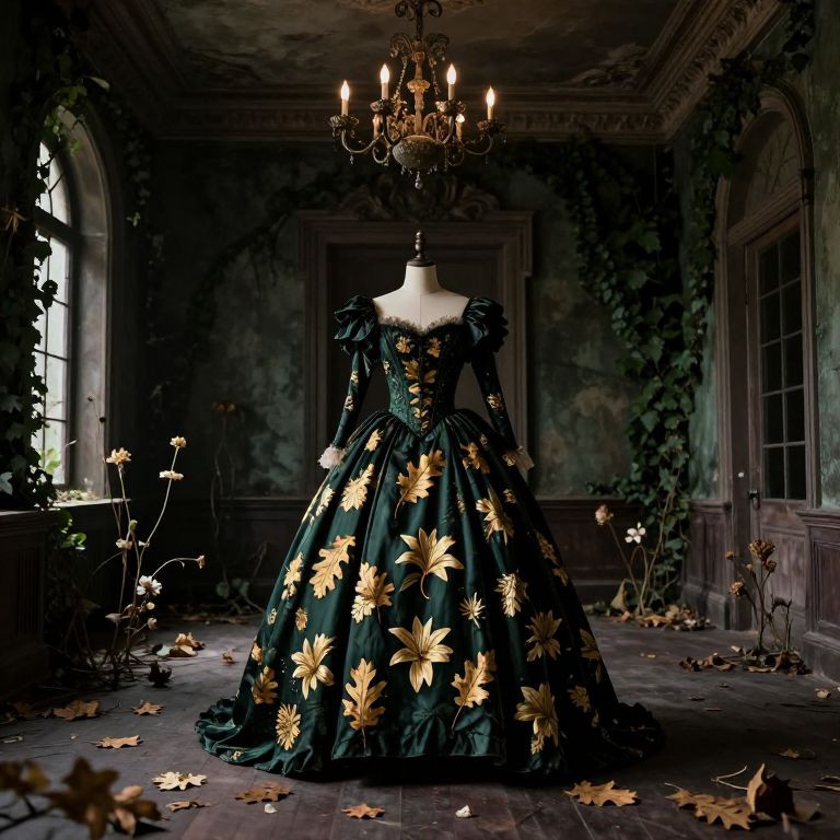 The image depicts a dark, eerie interior space reminiscent of a 16th-century mansion, bathed in a moody, cinematic light. Dominating the center of the room is a striking, dark green dress adorned with intricate patterns of dead oak leaves and gold lilies, creating a striking contrast against the gloomy backdrop. The dress, which appears to be a gown, is displayed on a mannequin, adding a sense of mystery and intrigue to the scene. The walls are covered in ivy, enhancing the sense of decay and abandonment, while dead flowers grow throughout the room, further emphasizing the desolate atmosphere. The floor is strewn with fallen leaves and petals, adding to the overall sense of neglect. The room is symmetrically arranged, with a chandelier hanging from the ceiling, casting a soft glow that highlights the dress and the intricate details of the ivy-covered walls. The overall composition is centered, drawing the viewer's eye directly to the dress and the surrounding elements, creating a sense of balance and harmony within the chaotic scene.