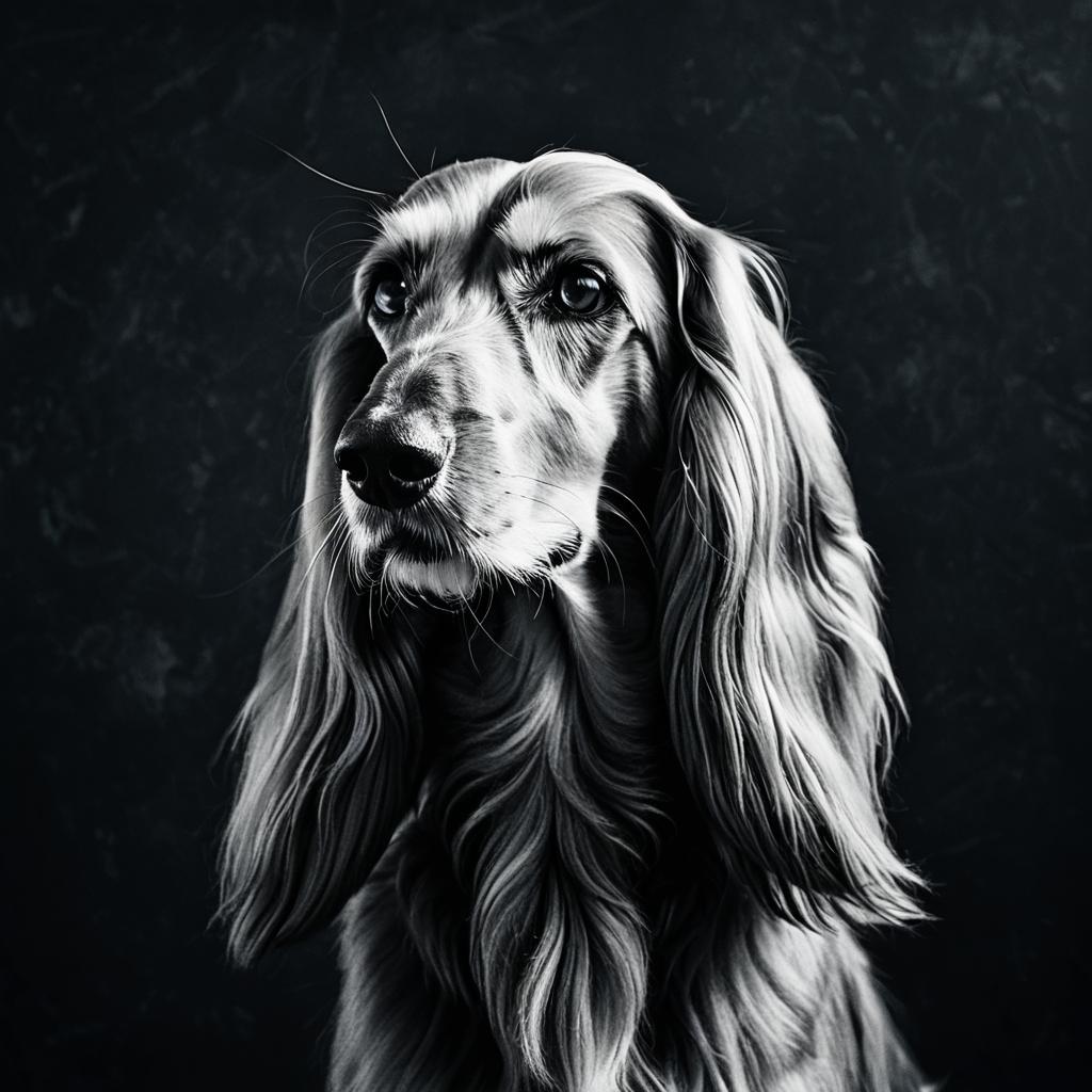 Mural editorial portrait of afghan hound dog, elegant and regal, with cool slate gray background and high contrast rembrandt lighting, professional color grading.