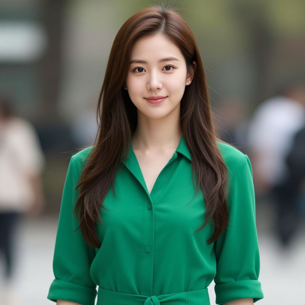 Photograph of an attractive young East Asian woman with long, straight black hair, wearing a bright green button-up shirt, smiling softly in a blurred urban
