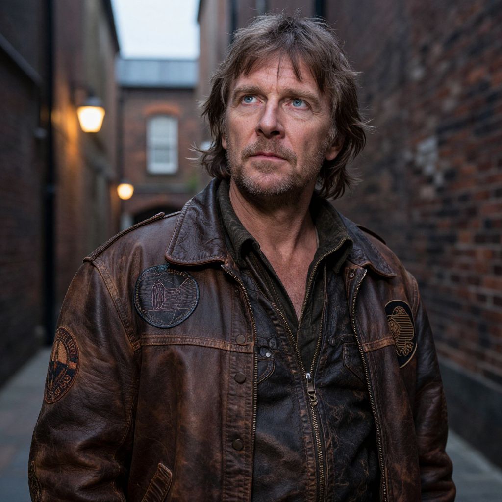 Photograph of a middle-aged man with shoulder-length, tousled brown hair and a beard, standing in a narrow, dimly-lit alleyway. He has blue eyes and a serious expression. He wears a worn, brown leather jacket with multiple patches on the sleeves, over a dark shirt. The brick walls of the alleyway are visible in the background, with a single, warm yellow light fixture on the left. The image has a slightly moody, cinematic quality with a shallow depth of field, focusing sharply on the man while the background is softly blurred.