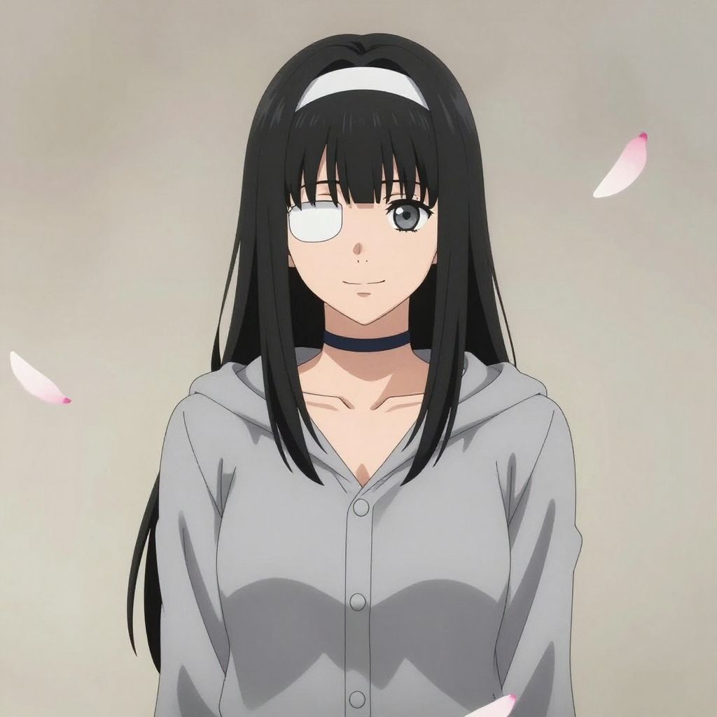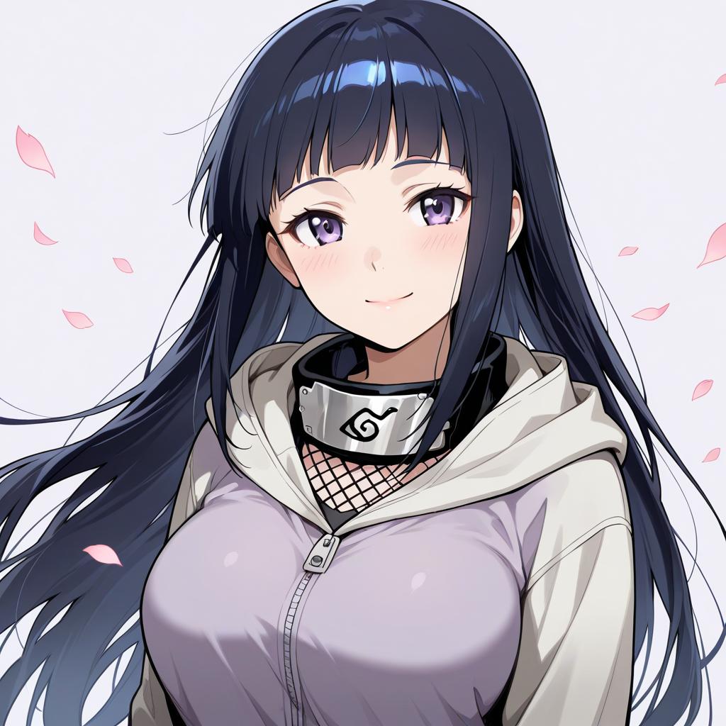 Hinata, hyuuga hinata, 1girl, bangs, empty_eyes, black_hair, blunt_bangs, grey_eyes, grey_sleeves, headband around_neck, highres, hime cut, hooded cardigan, long sleeves, looking_at_viewer, petals, smile, solo, straight hair, upper body, hooded jacket, simple_background