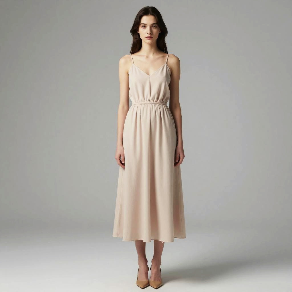 Photograph of a young woman standing against a plain, light gray background. She has long, straight, dark brown hair and pale skin. She wears a sleeveless, knee-length, pale pink dress with a V-neck and a cinched waist, made of a soft, flowing fabric. Her dress has thin, spaghetti straps. She is also wearing beige high-heeled shoes. Her expression is neutral, and she stands with her arms relaxed by her sides. The lighting is even, highlighting the smooth texture of her dress and the subtle sheen of her shoes.