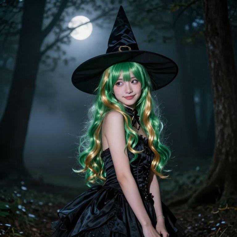 A stylish girl in her early 20s with a vibrant green and gold colored wig for Halloween, dressed as a witch in a pointed hat and flowing black dress, posing in a foggy forest clearing at night with moonlight filtering through the trees, her face showing a friendly, curious expression with soft freckles and a hint of mischief.