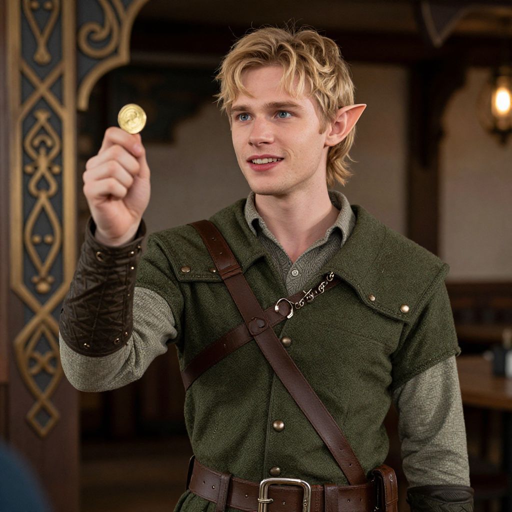 A young half-elf man with short blonde hair, white skin, and pointed ears, dressed in a ranger outfit, stands in a tavern with intricate details, natural lighting, and a cheerful attitude, flipping a gold coin.