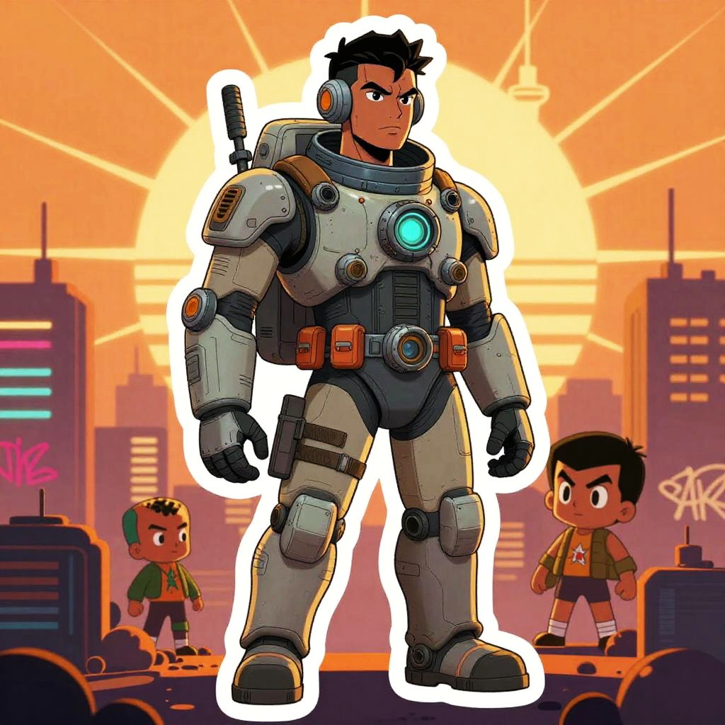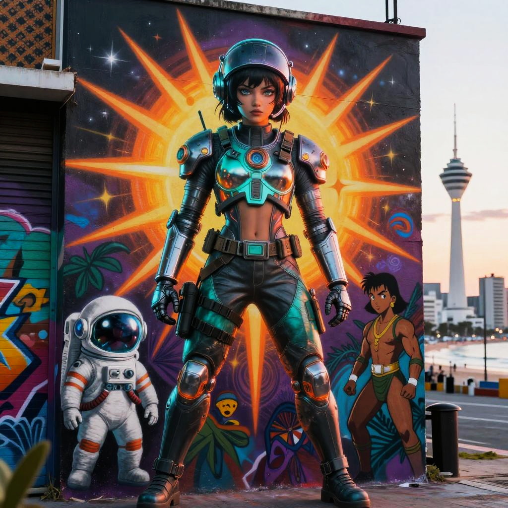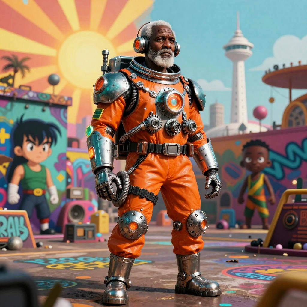 Illustration done in a modern surrealism style, portrait, elderly man, fashion, surreal fantasy, metal gear, orange teal light, dramatic, tough, cute, Star Blazers, Anime, Wakanda, Africa, Akira, cartoon, exaggerated, astronaut, tactical gear, depth of field, super detailed sun rays, neon, graffiti, full body, rain-soaked reflective streets, white tower rising skyward in the background, Bogolan pattern fabric.