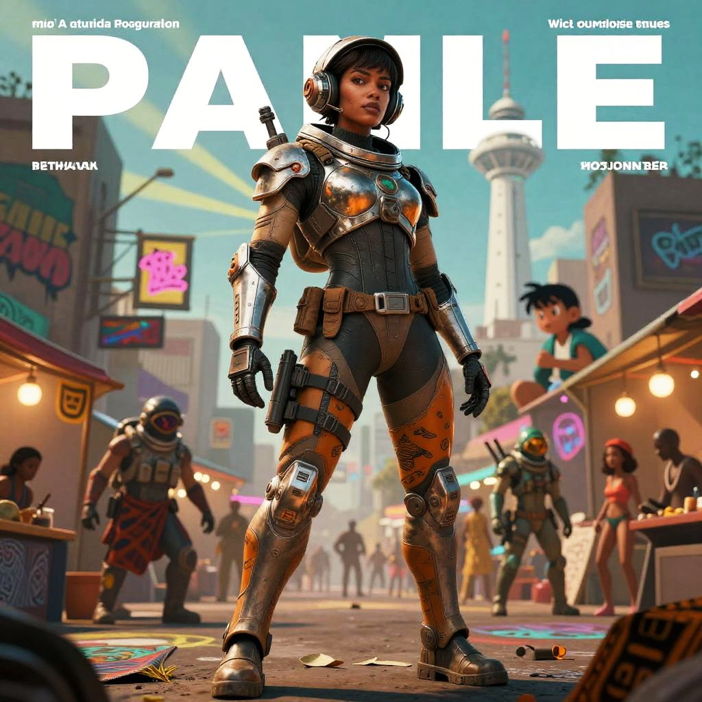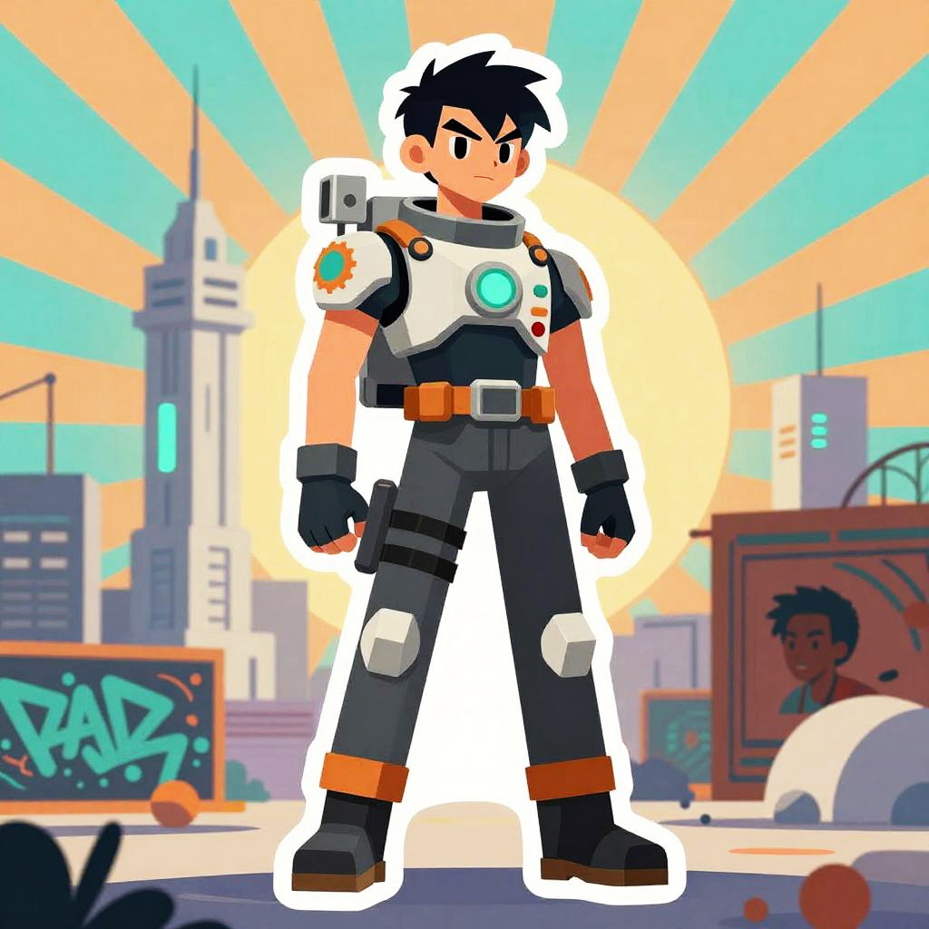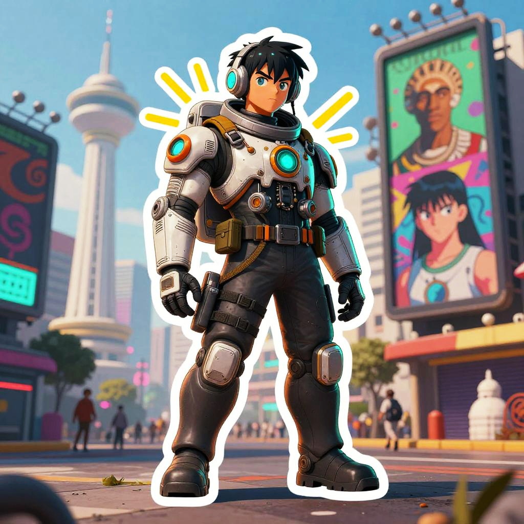 Illustration done in a modern surrealism style, portrait, elderly man, fashion, surreal fantasy, metal gear, orange teal light, dramatic, tough, cute, Star Blazers, Anime, Wakanda, Africa, Akira, cartoon, exaggerated, astronaut, tactical gear, depth of field, super detailed sun rays, neon, graffiti, full body, rain-soaked reflective streets, white tower rising skyward in the background, Bogolan pattern fabric.