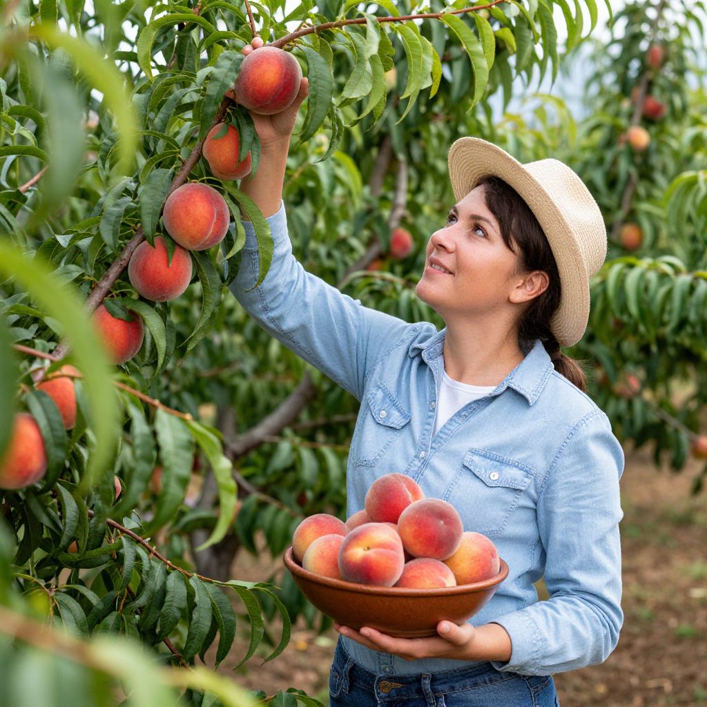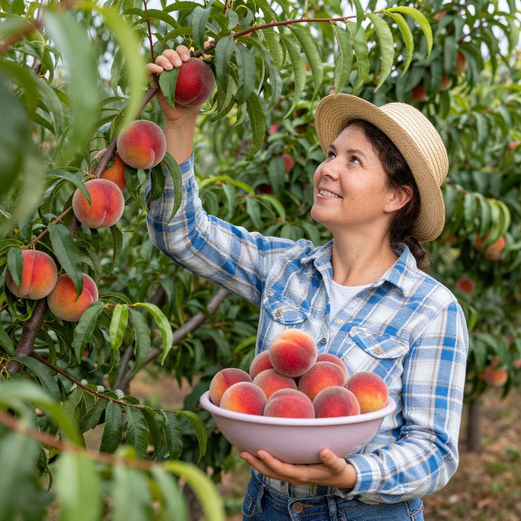 Woman harvesting vibrant nectarines from lush green trees in an orchard, holding a bowl filled with freshly picked fruit while smiling amidst rows of fruit-bearing branches.