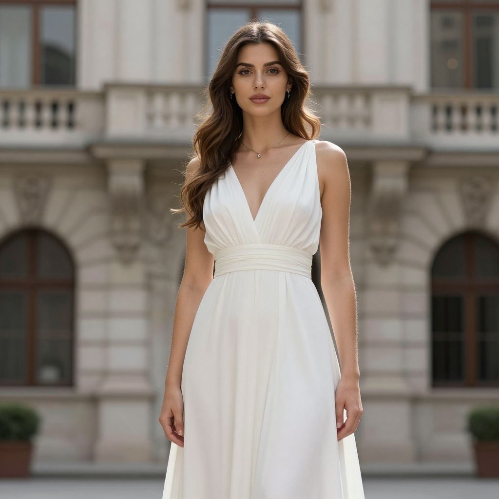 Photograph of a beautiful woman with long brown hair, wearing a sleeveless, deep V-neck white dress, standing in front of a historic stone building