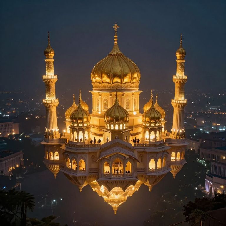 Photograph of a grand, illuminated mosque at night, showcasing its golden domes and minarets glowing against a dark, starless sky. The mosque's intricate architecture features multiple domes, with the central dome being the largest, and four minarets standing tall on each corner. The building is surrounded by a reflective pool, mirroring its illuminated form. Small city lights can be seen in the background, highlighting the mosque's central location. The warm, golden lights contrast sharply with the dark night sky, creating a striking visual effect. The image is rich in detail and texture, emphasizing the mosque's ornate design and majestic presence.