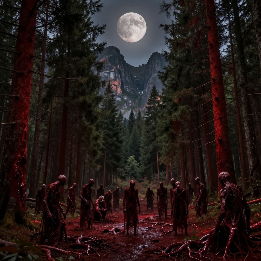 Photograph-like digital artwork of a moonlit forest with a full moon, tall trees, and a group of zombie-like figures standing in a blood-st
