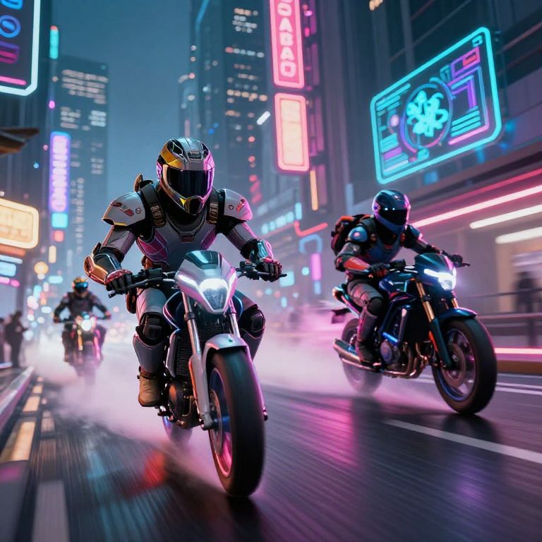 Neon-lit city night; three motorcyclists in futuristic helmets speed through a bustling street, surrounded by vibrant, colorful digital billboards.
