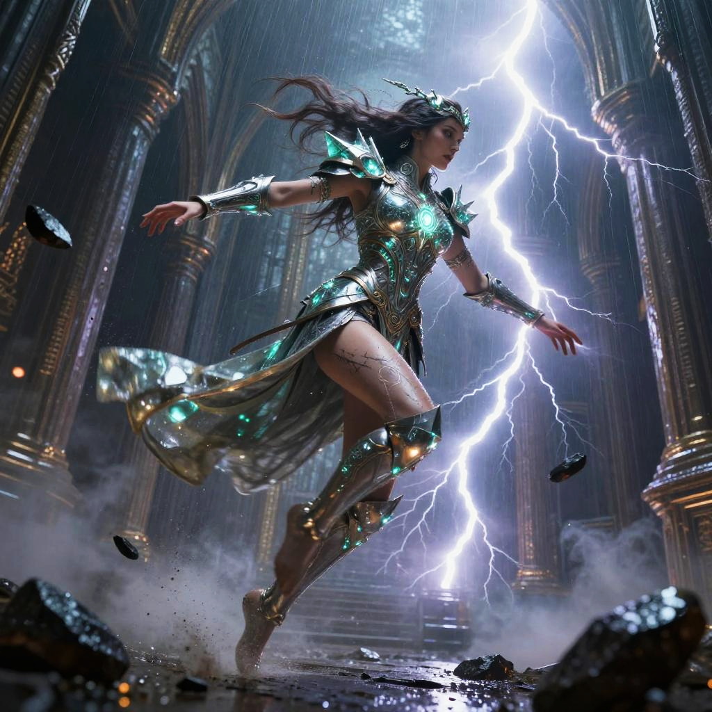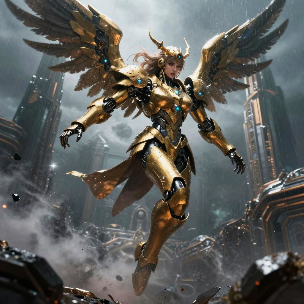 Razor-sharp cybernetic falconer, wearing feather-like kinetic armor with high-frequency blade edges and holo feathers, in wind-swept high cliff platform with cascading data stream waterfalls, mid-leap power strike through flying debris, rain mist and sparks, cinematic rim light with wet reflections, volumetric fog, particle embers, ultra-detailed skin and armor scratches, dynamic motion blur trails, dramatic high contrast, teal-and-magenta color grade, depth of field, low-angle perspective, rule-of-thirds composition, epic science-fantasy mood, premium digital illustration, concept art realism