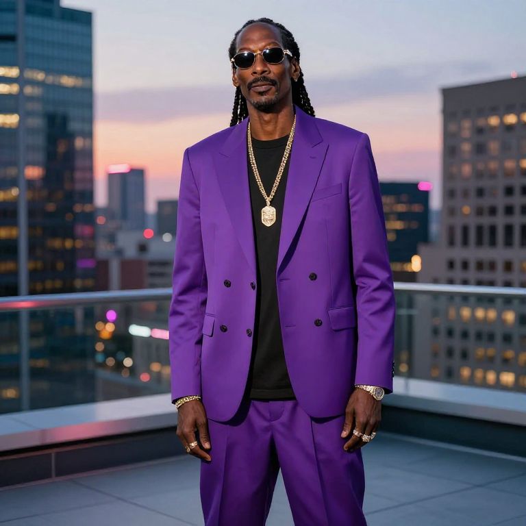 Snoop Dogg in a vibrant purple suit, standing confidently on a modern city rooftop at dusk, neon lights glowing in the background, smooth hip-hop vibe, stylish and charismatic, detailed textures and atmospheric lighting