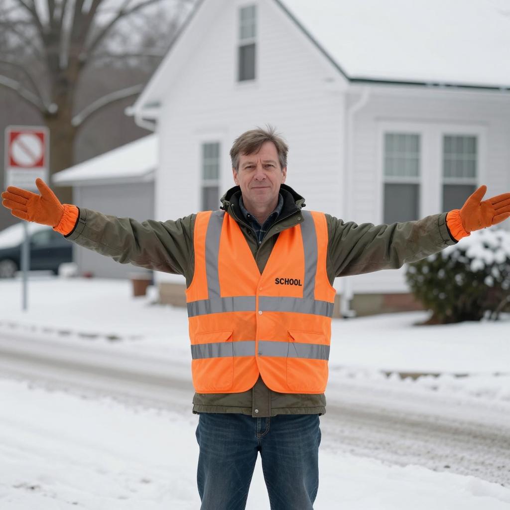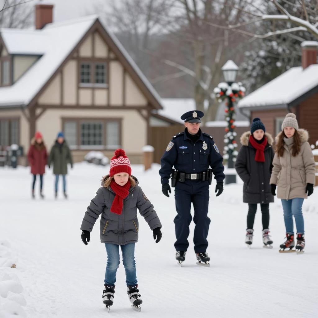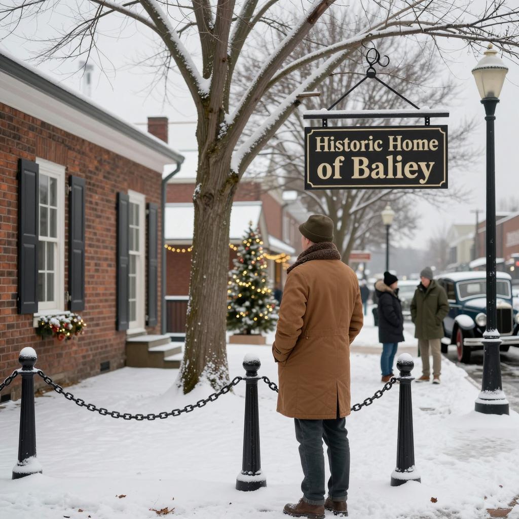 Snow-covered street scene. Man in brown coat and hat faces sign reading "Historic Home of Baliey" on brick building. Leafless tree in foreground, black post-and-chain barrier in front. Background includes festive decorations, vintage car, and two people standing. Lamp post on right. Overcast light.