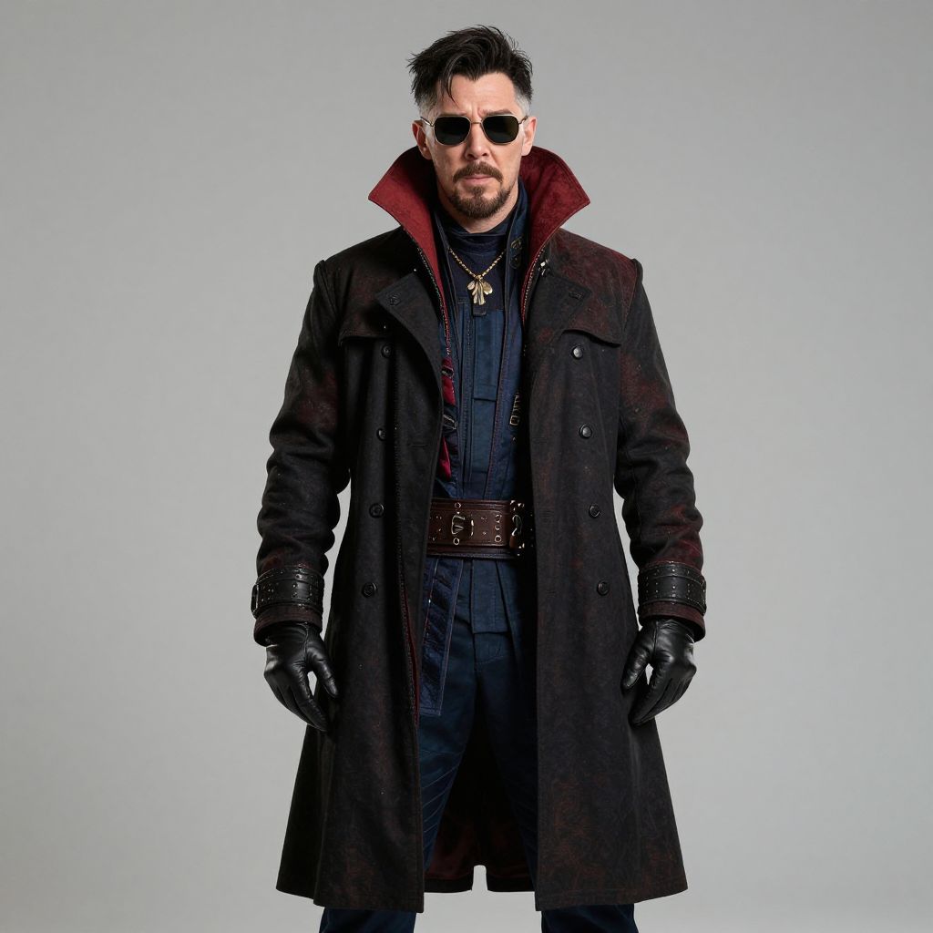 Doctor strange costume, 1boy, male focus, solo, coat, gloves, facial hair, belt, mustache, black gloves, sunglasses, standing, trench coat, looking at viewer, realistic, pants, black hair, beard, black coat, jewelry, necklace, closed mouth